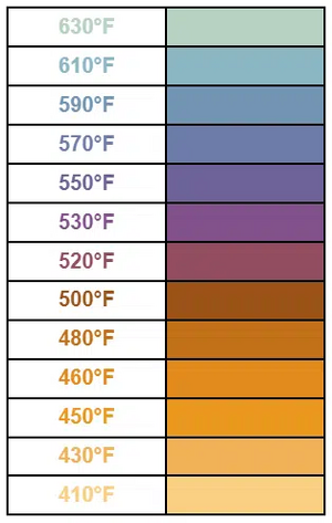 Depending on the temperature that the steel is held at during tempering, the metal actually changes its color. Lower tempering temperatures primarily relieve internal stresses and slightly lower the brittleness, while higher temperatures (up to the critical temperature) result in larger decreases in brittleness. This sacrifices yield and tensile strength for improved elasticity and plasticity. The full chart of tempering colors is below: